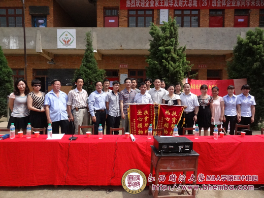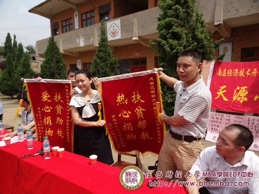 接下來是設(shè)備財(cái)物交接儀式和學(xué)校為企業(yè)家學(xué)員們頒發(fā)致謝錦旗。財(cái)大總裁26班對(duì)天源小學(xué)的慈善捐助活動(dòng)在溫馨的大合影中結(jié)束。