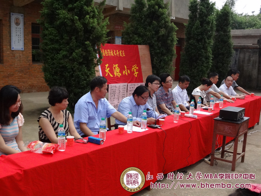 南昌經(jīng)濟(jì)開發(fā)區(qū)天源小學(xué),這里已是市郊,地形是典型的南方低地丘陵,并不平坦,但也不遠(yuǎn)是山水環(huán)繞,鄉(xiāng)村周圍路勁多是煤渣路,也修有不寬的水泥路。這里村莊多是舊山字屋、兩三層的舊樓房,確實(shí)不算富裕,尚待開發(fā)。天源小學(xué)就坐落在村莊附近的一片小土坡旁邊。來到天源小學(xué),門口有十名小學(xué)女學(xué)生,站立兩旁,揮旗歡迎。進(jìn)入校門口,王殿華同學(xué)見小女生們,在太陽底下站立歡飲,很是辛苦,就要她們撤掉,回校園樹蔭底下休息去。王殿華同學(xué)對(duì)小女生們的細(xì)微關(guān)懷,在場(chǎng)學(xué)校老師和其他總裁學(xué)員都無不為此小細(xì)節(jié)而深深打動(dòng)。