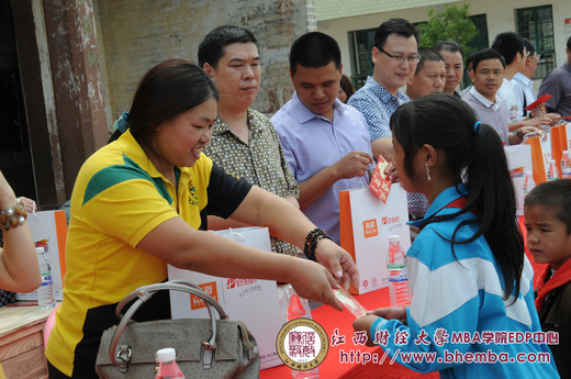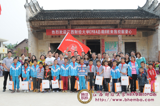 捐獻(xiàn)愛(ài)心,履行社會(huì)責(zé)任,為祖國(guó)的未來(lái)奉獻(xiàn)一份炙熱的關(guān)愛(ài)!2012年9月17日上午,江西財(cái)經(jīng)大學(xué)EMBA贛州總裁八班學(xué)員在班主任李老師和班委成員的帶領(lǐng)下,從贛州市出發(fā),驅(qū)車一個(gè)多小時(shí),來(lái)到革命老區(qū)、將軍縣———興國(guó)縣,為興國(guó)楊村小學(xué)的20名一、二年級(jí)的貧困學(xué)生們奉獻(xiàn)真情,捐獻(xiàn)愛(ài)心。