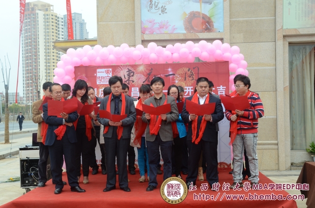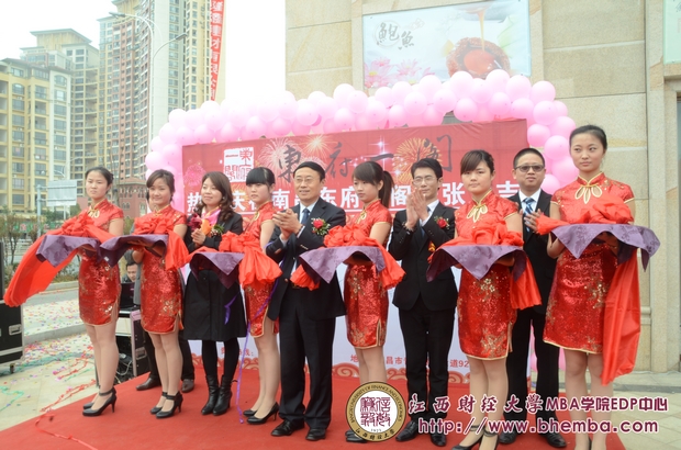 接下來由南昌餐飲烹飪協(xié)會涂會長發(fā)表重要講話,涂會長首先對東府一閣的開業(yè)表達了衷心的祝賀,繼而提出了立足南昌、堅持高端、做出特色和打造品牌的期許,并祝東府一閣生意興隆財源廣進。江西財大MBA學院EDP中心齊玲博主任也隨后致開業(yè)賀詞,齊主任代表財經(jīng)大學MBA學院全體兩千多名總裁班同學向酒店開業(yè)致以最衷心的祝賀,對酒店董事長胡譯方女士的在校表現(xiàn)和事業(yè)成就抱以熱情的嘉賞,也對酒店的未來發(fā)展前景表達最美好的祝愿,還對在同學們如此珍惜情誼互相幫襯的狀況表示欣羨。隨后東府一閣總經(jīng)理胡澤之,發(fā)表開業(yè)歡迎詞,他代表全酒店向到場的嘉賓客人表示熱烈的歡迎,對酒店的定位特色做了必要的介紹,并承諾以一流的品質一流的服務接納市民顧客,爭取做成南昌市最高檔最理想的海鮮類品牌大酒店。最后,涂會長、齊主任、余顧問和胡經(jīng)理一起上臺為東府一閣的開業(yè)盛大剪彩,在鮮花、爆竹與禮炮中,東府一閣開張大吉。