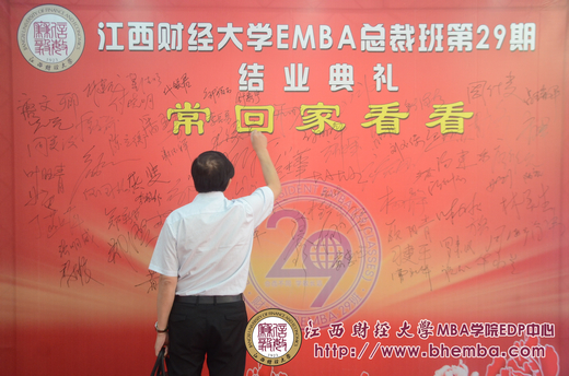 2012年7月22日,這是一個與眾不同的日子,也是一個值得慶祝的日子,今天的總裁29班在歷經(jīng)一年的學(xué)習(xí)完成了他們的學(xué)業(yè),從而舉行隆重的畢業(yè)典禮。早上九點時分,踏上鮮紅的地毯,走進(jìn)EMBA學(xué)院的三樓,我們看到的是總裁29班的全體照片,每個學(xué)員的臉上都有著初入學(xué)堂的激動與對未來的期望與展望,因為這是他們?nèi)雽W(xué)的見證。29班同學(xué)們陸續(xù)來齊,教室外置有畢業(yè)主題的大紅底色簽名板,同學(xué)們紛紛留下了自己的親筆簽名,我們看到的是每個學(xué)員龍飛鳳舞、剛勁有力的簽名,這是你們畢業(yè)的見證,也是你們留給我們的記憶,我們會好好的惠存。