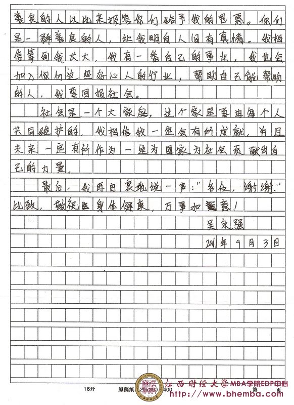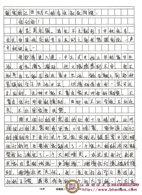 2011年9月16日,江西財(cái)經(jīng)大學(xué)MBA學(xué)院EDP中心的李芳老師收到一封需要轉(zhuǎn)給總裁28班同學(xué)的書信,寫信人是南昌縣滸南村的貧困家庭的孩子吳永強(qiáng)。