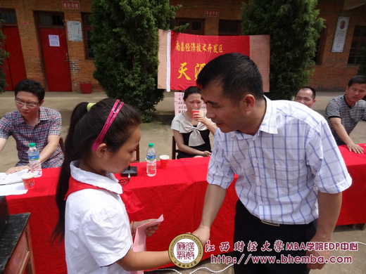 接下來是設備財物交接儀式和學校為企業(yè)家學員們頒發(fā)致謝錦旗。財大總裁26班對天源小學的慈善捐助活動在溫馨的大合影中結束。