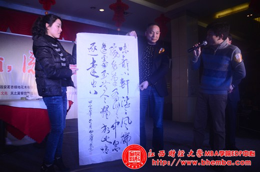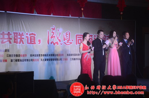 晚上6:30晚宴正式開始,出席本次聯(lián)誼領(lǐng)導(dǎo)分別是江西財經(jīng)大學(xué)MBA學(xué)院高層管理者培訓(xùn)與發(fā)展中心總顧問趙海博先生、江西財經(jīng)大學(xué)MBA學(xué)院EDP中心副主任漆飛女士、MBA校友會秘書長劉志鵬先生。